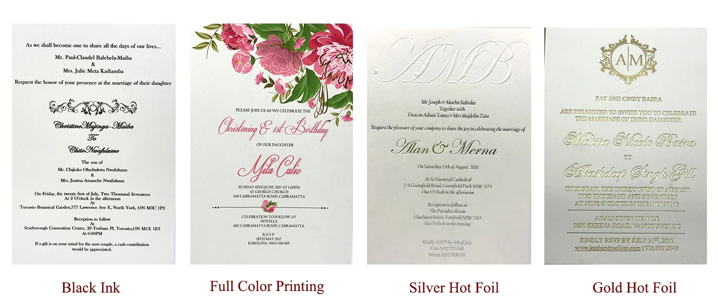 A: Yes. We can provide the printing service as follows: black ink printing, full color printing, silver hot foil, gold hot foil etc. We can accept PDF, Word, JPG, AI format file.